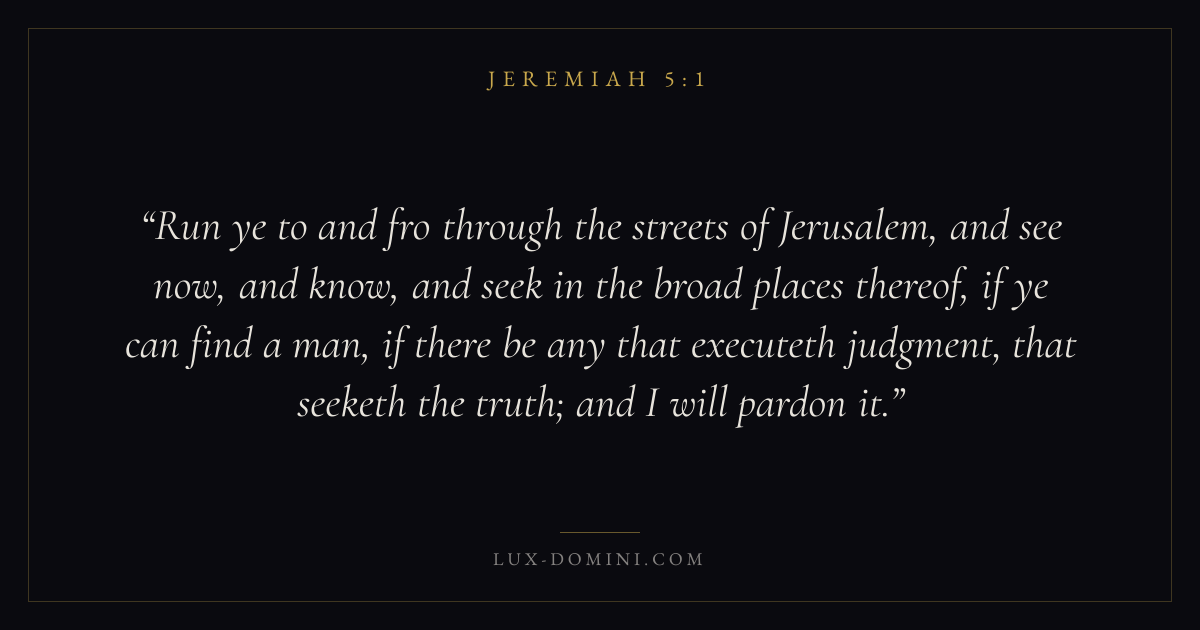 Run ye to and fro through the streets of Jerusalem, and see now, and know, and seek in the broad places thereof, if ye can find a man, if there be any that executeth judgment, that seeketh the truth; and I will pardon it.