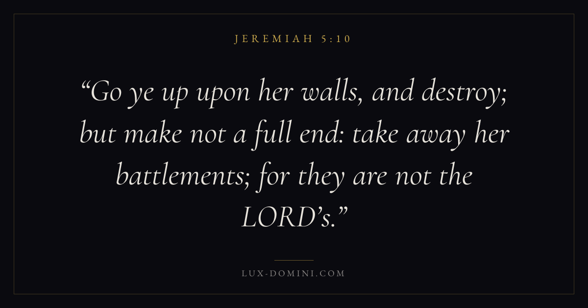 Go ye up upon her walls, and destroy; but make not a full end: take away her battlements; for they are not the LORD’s.