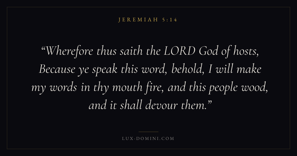 Wherefore thus saith the LORD God of hosts, Because ye speak this word, behold, I will make my words in thy mouth fire, and this people wood, and it shall devour them.