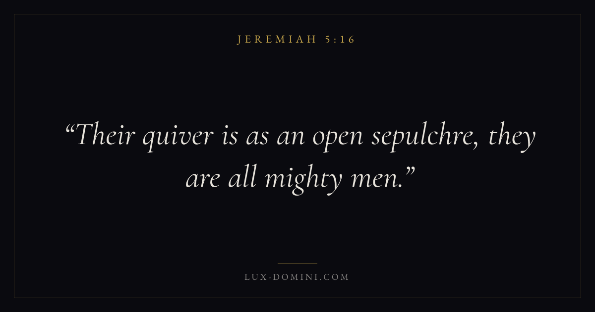 Books / Jeremiah / Chapter 5 / Verse 16 ← Jeremiah 5:15 Jeremiah 5:16 Jeremiah 5:17 → Their quiver is as an open sepulchre, they are all mighty men. Download verse card Share on Twitter Share on Facebook Pin it ✦ Key themes HopeSuffering and trialsJustice and mercyTruthJudgment Read with Jeremiah 5:15Jeremiah 5:17Romans 8:24Revelation 21:4 Related topics Bible verses about hopeBible verses about suffering and trialsBible verses about justice and mercyBible verses about truth ✦ Jeremiah Chapter 5 verses V. 1 V. 2 V. 3 V. 4 V. 5 V. 6 V. 7 V. 8 V. 9 V. 10 V. 11 V. 12 V. 13 V. 14 V. 15 V. 16 V. 17 V. 18 V. 19 V. 20 V. 21 V. 22 V. 23 V. 24 V. 25 V. 26 V. 27 V. 28 V. 29 V. 30 V. 31