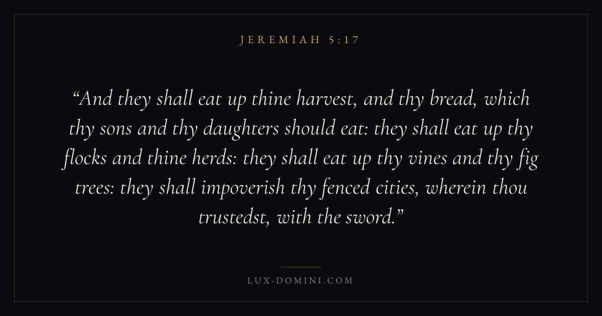 And they shall eat up thine harvest, and thy bread, which thy sons and thy daughters should eat: they shall eat up thy flocks and thine herds: they shall eat up thy vines and thy fig trees: they shall impoverish thy fenced cities, wherein thou trustedst, with the sword.