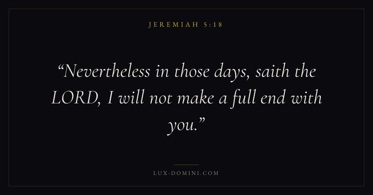 Books / Jeremiah / Chapter 5 / Verse 18 ← Jeremiah 5:17 Jeremiah 5:18 Jeremiah 5:19 → Nevertheless in those days, saith the LORD, I will not make a full end with you. Download verse card Share on Twitter Share on Facebook Pin it ✦ Key themes HopeSuffering and trialsJustice and mercyTruthJudgment Read with Jeremiah 5:15Jeremiah 5:16Romans 8:24Revelation 21:4 Related topics Bible verses about hopeBible verses about suffering and trialsBible verses about justice and mercyBible verses about truth ✦ Jeremiah Chapter 5 verses V. 1 V. 2 V. 3 V. 4 V. 5 V. 6 V. 7 V. 8 V. 9 V. 10 V. 11 V. 12 V. 13 V. 14 V. 15 V. 16 V. 17 V. 18 V. 19 V. 20 V. 21 V. 22 V. 23 V. 24 V. 25 V. 26 V. 27 V. 28 V. 29 V. 30 V. 31