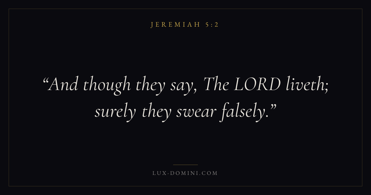 Books / Jeremiah / Chapter 5 / Verse 2 ← Jeremiah 5:1 Jeremiah 5:2 Jeremiah 5:3 → And though they say, The LORD liveth; surely they swear falsely. Download verse card Share on Twitter Share on Facebook Pin it ✦ Key themes HopeSuffering and trialsJustice and mercyTruthJudgment Read with Jeremiah 5:1Romans 8:24Revelation 21:4Romans 8:18 Related topics Bible verses about hopeBible verses about suffering and trialsBible verses about justice and mercyBible verses about truth ✦ Jeremiah Chapter 5 verses V. 1 V. 2 V. 3 V. 4 V. 5 V. 6 V. 7 V. 8 V. 9 V. 10 V. 11 V. 12 V. 13 V. 14 V. 15 V. 16 V. 17 V. 18 V. 19 V. 20 V. 21 V. 22 V. 23 V. 24 V. 25 V. 26 V. 27 V. 28 V. 29 V. 30 V. 31