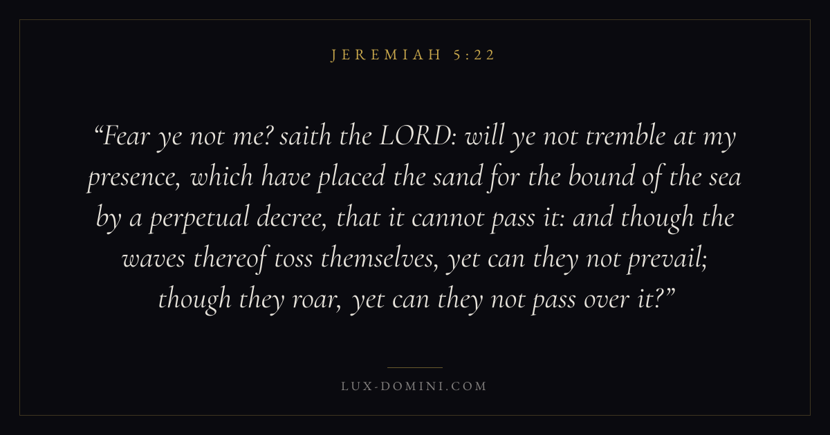 Fear ye not me? saith the LORD: will ye not tremble at my presence, which have placed the sand for the bound of the sea by a perpetual decree, that it cannot pass it: and though the waves thereof toss themselves, yet can they not prevail; though they roar, yet can they not pass over it?