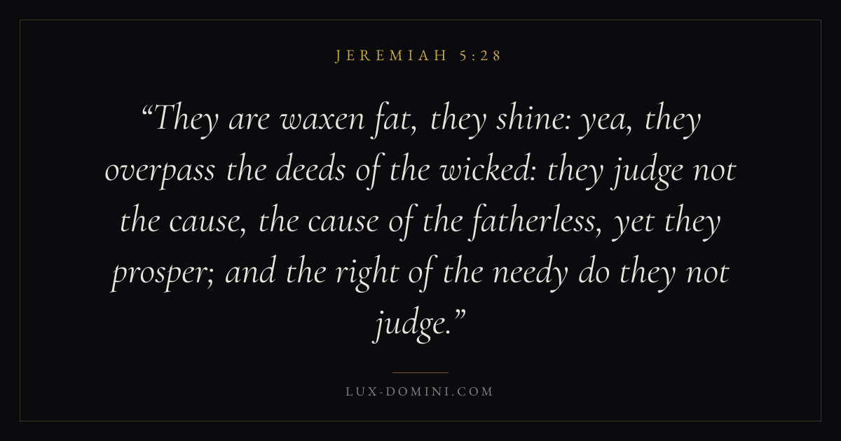 They are waxen fat, they shine: yea, they overpass the deeds of the wicked: they judge not the cause, the cause of the fatherless, yet they prosper; and the right of the needy do they not judge.