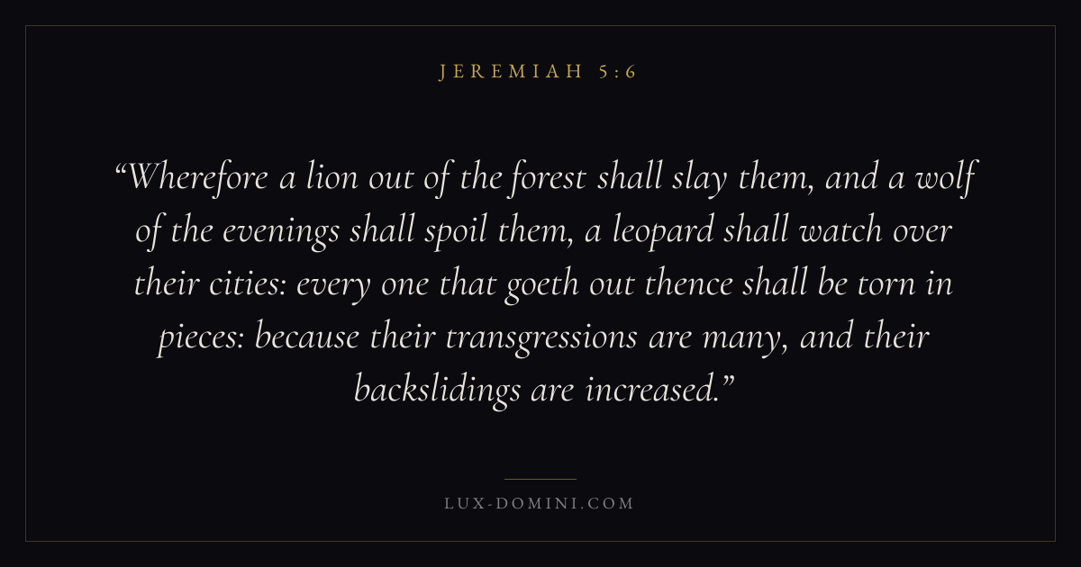 Wherefore a lion out of the forest shall slay them, and a wolf of the evenings shall spoil them, a leopard shall watch over their cities: every one that goeth out thence shall be torn in pieces: because their transgressions are many, and their backslidings are increased.