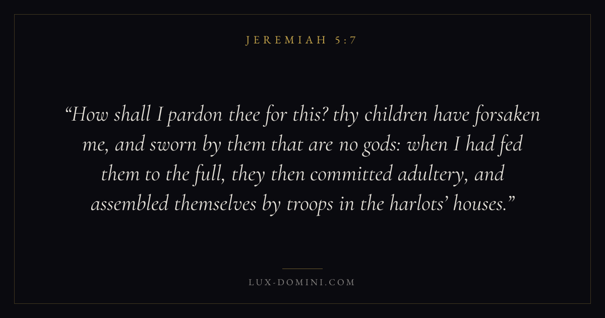 How shall I pardon thee for this? thy children have forsaken me, and sworn by them that are no gods: when I had fed them to the full, they then committed adultery, and assembled themselves by troops in the harlots’ houses.