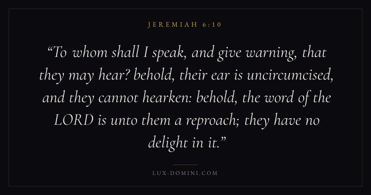 To whom shall I speak, and give warning, that they may hear? behold, their ear is uncircumcised, and they cannot hearken: behold, the word of the LORD is unto them a reproach; they have no delight in it.