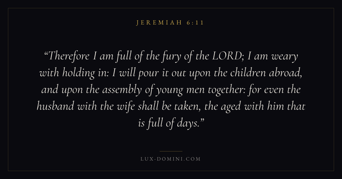 Therefore I am full of the fury of the LORD; I am weary with holding in: I will pour it out upon the children abroad, and upon the assembly of young men together: for even the husband with the wife shall be taken, the aged with him that is full of days.