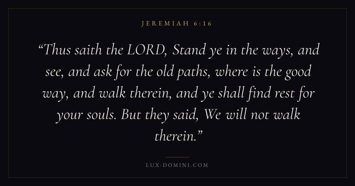 Thus saith the LORD, Stand ye in the ways, and see, and ask for the old paths, where is the good way, and walk therein, and ye shall find rest for your souls. But they said, We will not walk therein.