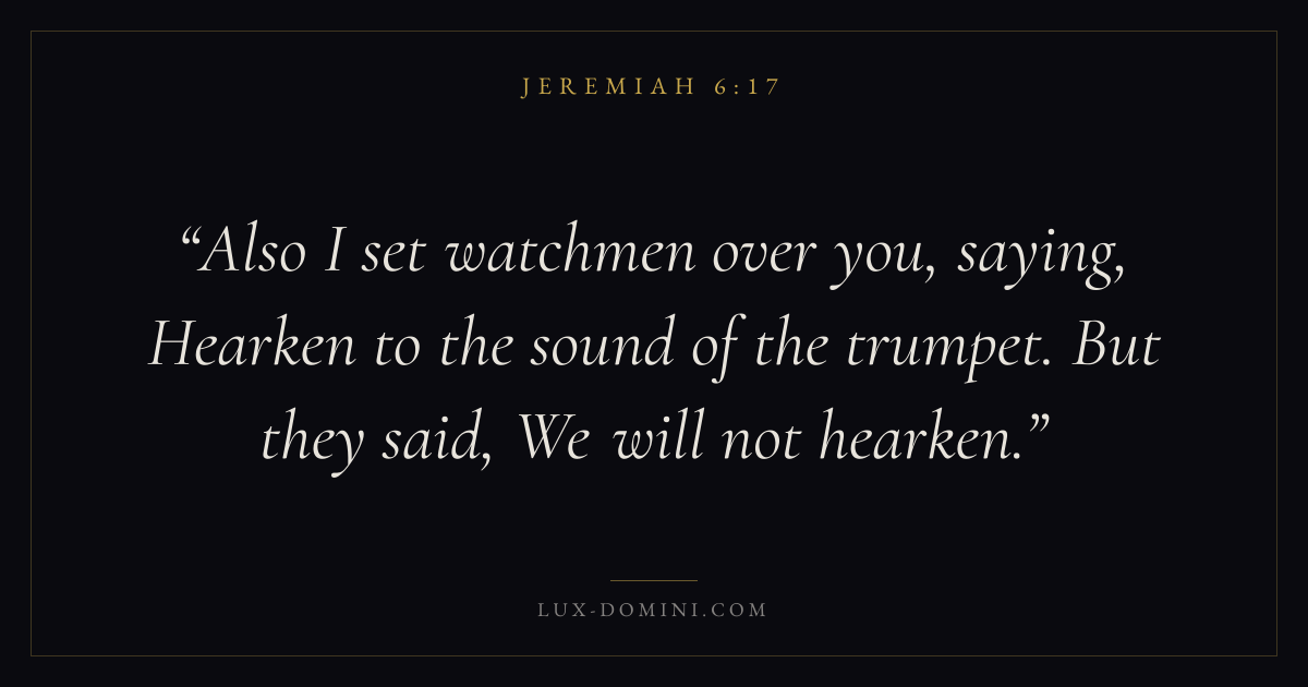 Also I set watchmen over you, saying, Hearken to the sound of the trumpet. But they said, We will not hearken.