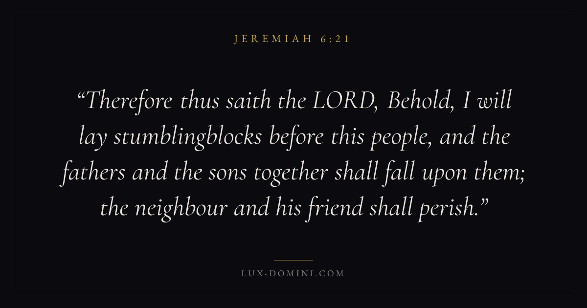 Therefore thus saith the LORD, Behold, I will lay stumblingblocks before this people, and the fathers and the sons together shall fall upon them; the neighbour and his friend shall perish.