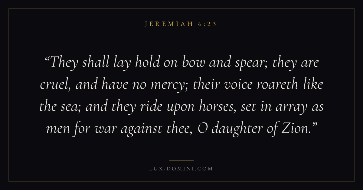 They shall lay hold on bow and spear; they are cruel, and have no mercy; their voice roareth like the sea; and they ride upon horses, set in array as men for war against thee, O daughter of Zion.