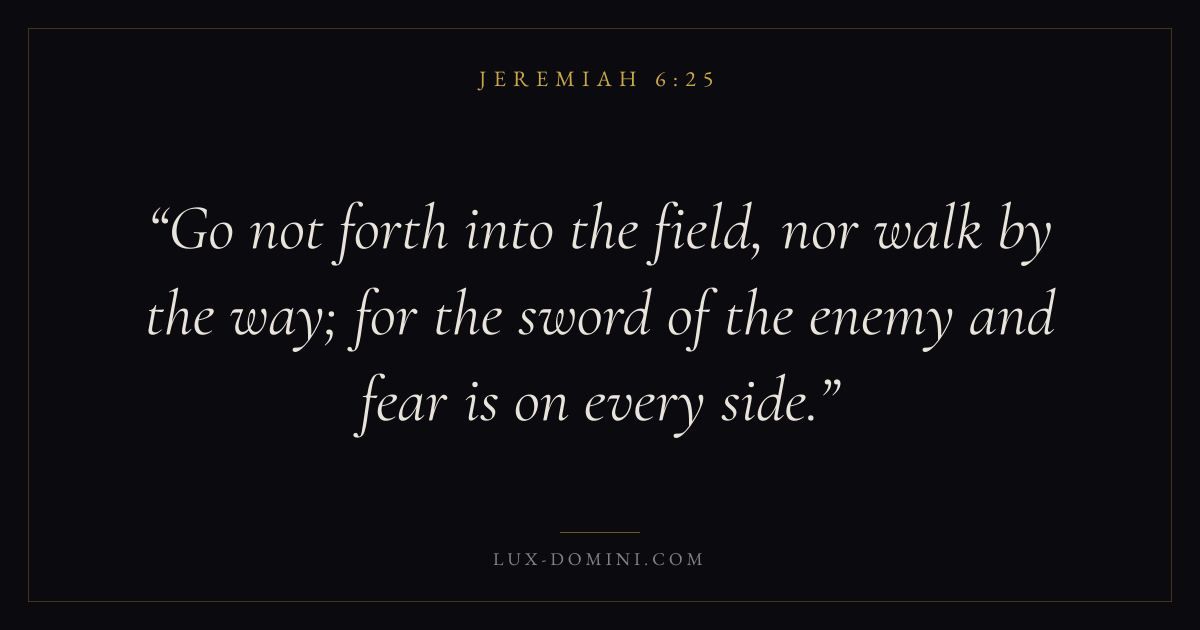 Go not forth into the field, nor walk by the way; for the sword of the enemy and fear is on every side.