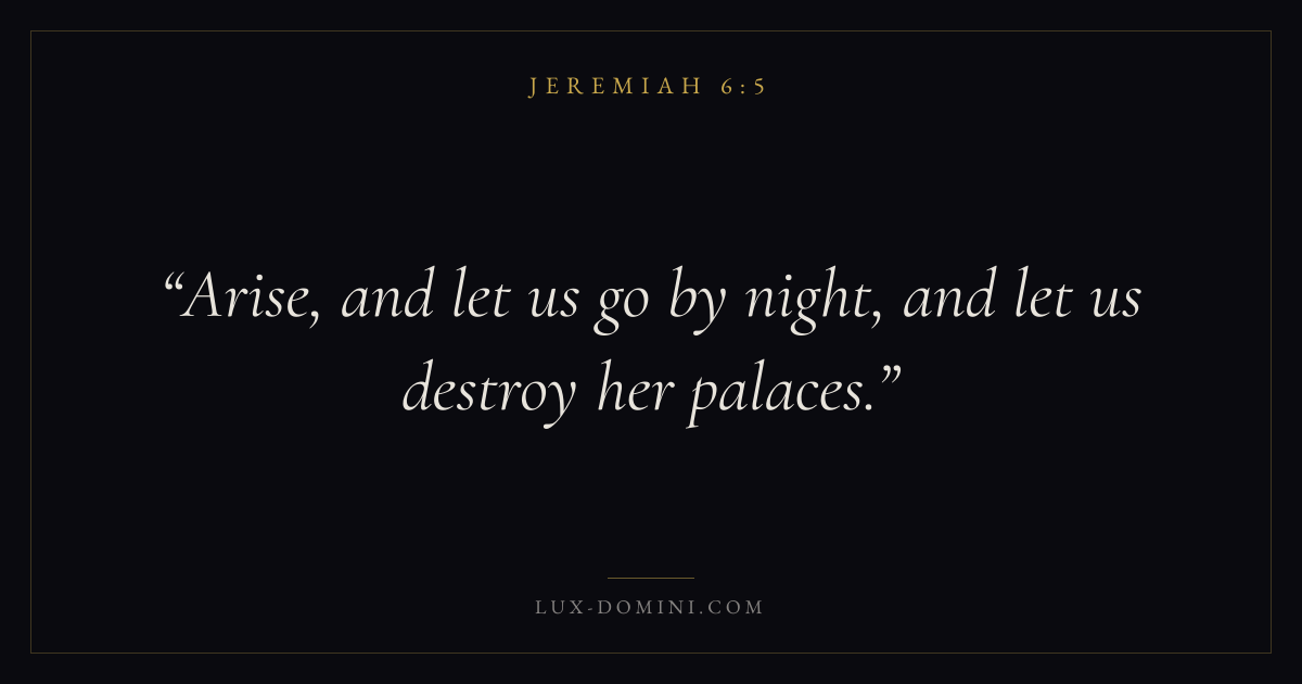 Books / Jeremiah / Chapter 6 / Verse 5 ← Jeremiah 6:4 Jeremiah 6:5 Jeremiah 6:6 → Arise, and let us go by night, and let us destroy her palaces. Download verse card Share on Twitter Share on Facebook Pin it ✦ Key themes HopeSuffering and trialsJustice and mercyJudgment Read with Jeremiah 6:1Jeremiah 6:2Romans 8:24Revelation 21:4 Related topics Bible verses about hopeBible verses about suffering and trialsBible verses about justice and mercy ✦ Jeremiah Chapter 6 verses V. 1 V. 2 V. 3 V. 4 V. 5 V. 6 V. 7 V. 8 V. 9 V. 10 V. 11 V. 12 V. 13 V. 14 V. 15 V. 16 V. 17 V. 18 V. 19 V. 20 V. 21 V. 22 V. 23 V. 24 V. 25 V. 26 V. 27 V. 28 V. 29 V. 30