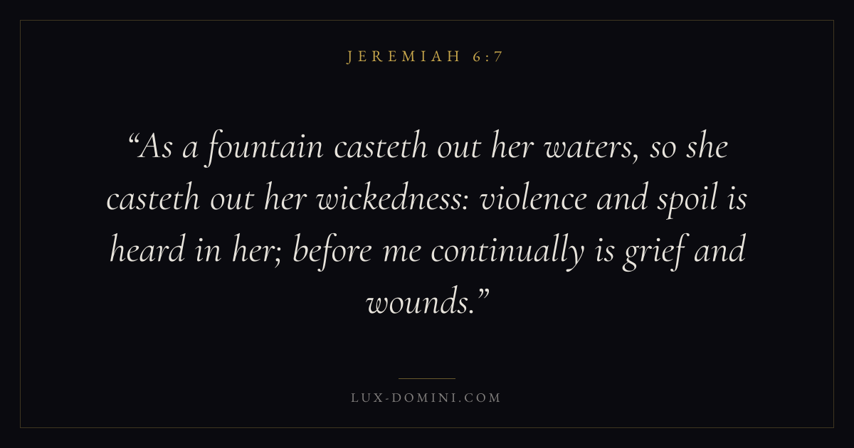 As a fountain casteth out her waters, so she casteth out her wickedness: violence and spoil is heard in her; before me continually is grief and wounds.