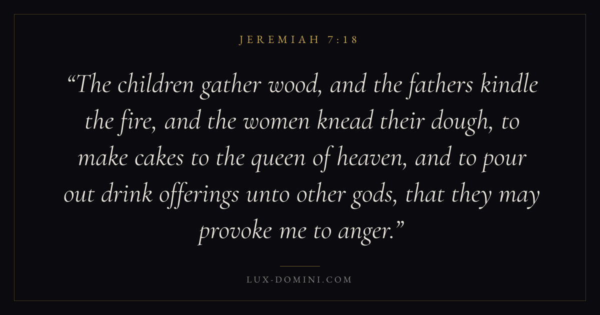 The children gather wood, and the fathers kindle the fire, and the women knead their dough, to make cakes to the queen of heaven, and to pour out drink offerings unto other gods, that they may provoke me to anger.