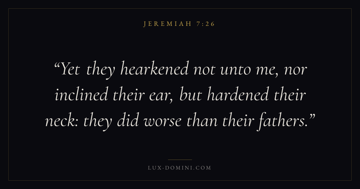 Yet they hearkened not unto me, nor inclined their ear, but hardened their neck: they did worse than their fathers.