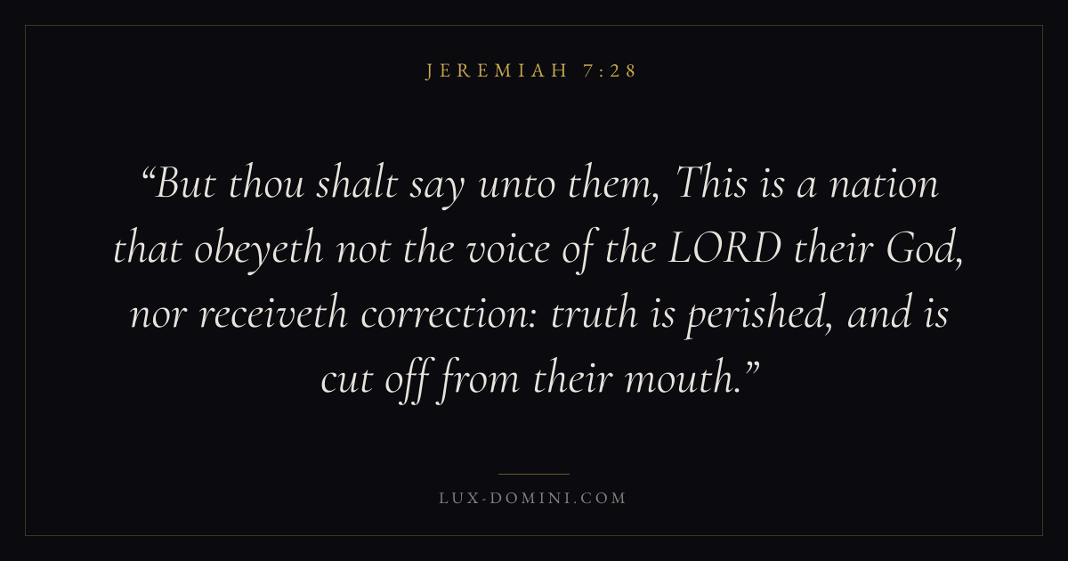 But thou shalt say unto them, This is a nation that obeyeth not the voice of the LORD their God, nor receiveth correction: truth is perished, and is cut off from their mouth.