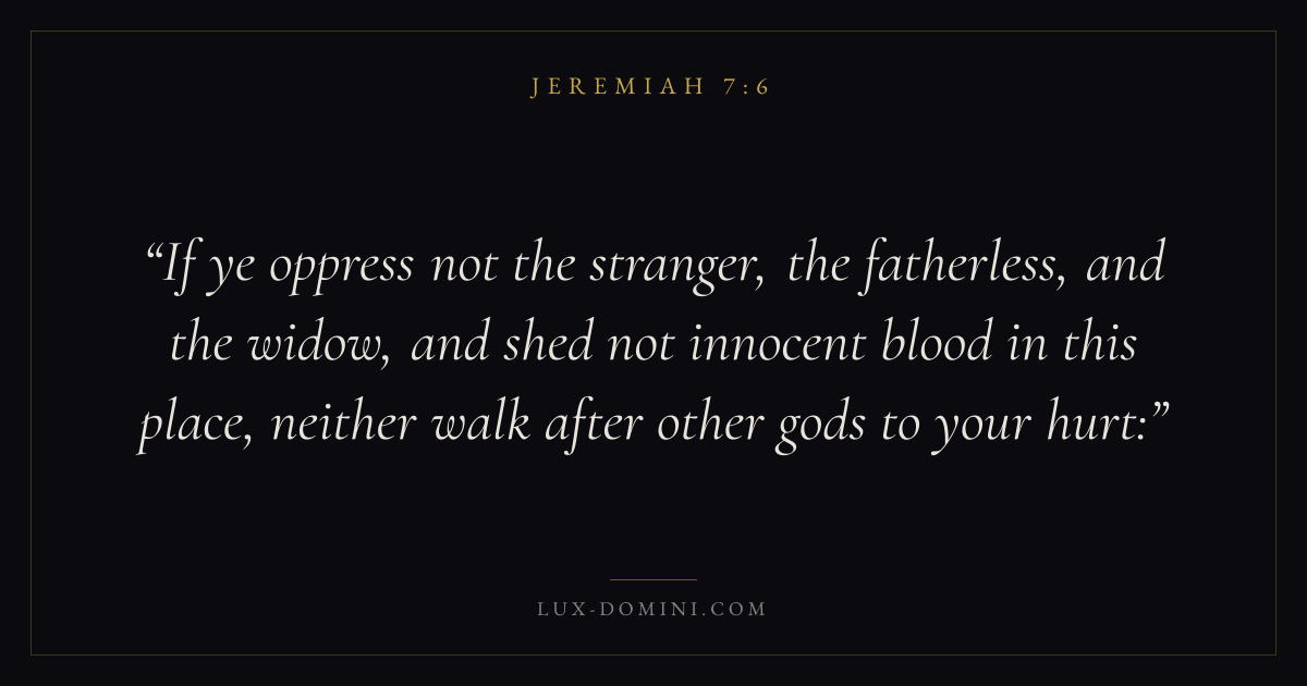 If ye oppress not the stranger, the fatherless, and the widow, and shed not innocent blood in this place, neither walk after other gods to your hurt: