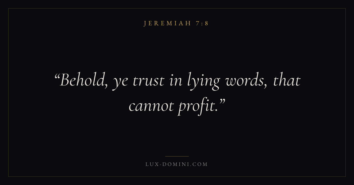 Books / Jeremiah / Chapter 7 / Verse 8 ← Jeremiah 7:7 Jeremiah 7:8 Jeremiah 7:9 → Behold, ye trust in lying words, that cannot profit. Download verse card Share on Twitter Share on Facebook Pin it ✦ Key themes FaithHopeSuffering and trialsJustice and mercyJudgment Read with Jeremiah 7:9Jeremiah 7:10Hebrews 11:1Romans 10:17 Related topics Bible verses about faithBible verses about hopeBible verses about suffering and trialsBible verses about justice and mercy ✦ Jeremiah Chapter 7 verses V. 1 V. 2 V. 3 V. 4 V. 5 V. 6 V. 7 V. 8 V. 9 V. 10 V. 11 V. 12 V. 13 V. 14 V. 15 V. 16 V. 17 V. 18 V. 19 V. 20 V. 21 V. 22 V. 23 V. 24 V. 25 V. 26 V. 27 V. 28 V. 29 V. 30 V. 31 V. 32 V. 33 V. 34