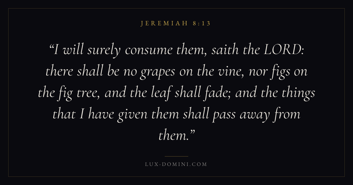 I will surely consume them, saith the LORD: there shall be no grapes on the vine, nor figs on the fig tree, and the leaf shall fade; and the things that I have given them shall pass away from them.