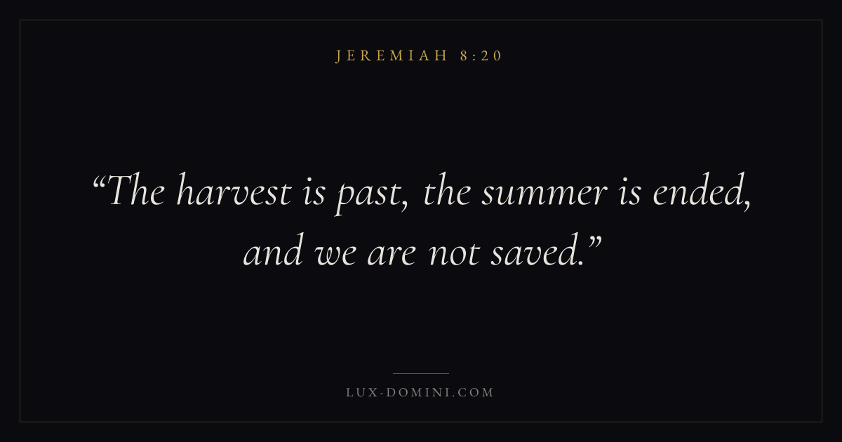 Books / Jeremiah / Chapter 8 / Verse 20 ← Jeremiah 8:19 Jeremiah 8:20 Jeremiah 8:21 → The harvest is past, the summer is ended, and we are not saved. Download verse card Share on Twitter Share on Facebook Pin it ✦ Key themes HopeSuffering and trialsJustice and mercySalvationJudgment Read with Jeremiah 8:18Jeremiah 8:19Romans 8:24Revelation 21:4 Related topics Bible verses about hopeBible verses about suffering and trialsBible verses about justice and mercyBible verses about salvation ✦ Jeremiah Chapter 8 verses V. 1 V. 2 V. 3 V. 4 V. 5 V. 6 V. 7 V. 8 V. 9 V. 10 V. 11 V. 12 V. 13 V. 14 V. 15 V. 16 V. 17 V. 18 V. 19 V. 20 V. 21 V. 22