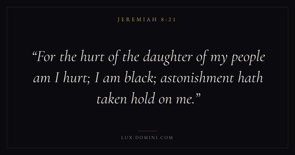 For the hurt of the daughter of my people am I hurt; I am black; astonishment hath taken hold on me.