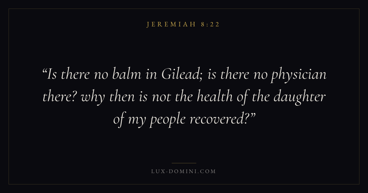 Is there no balm in Gilead; is there no physician there? why then is not the health of the daughter of my people recovered?