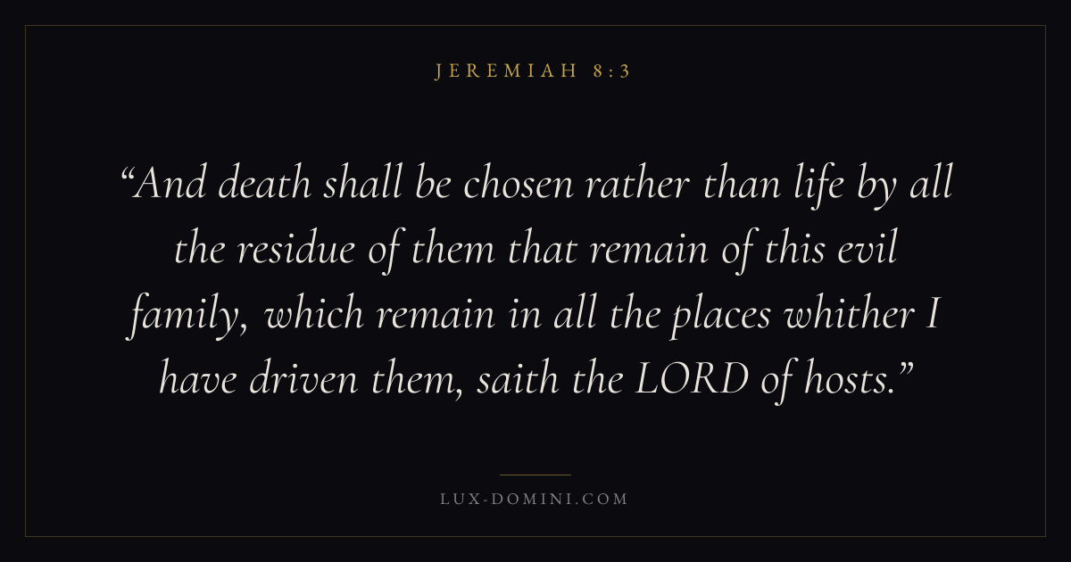 And death shall be chosen rather than life by all the residue of them that remain of this evil family, which remain in all the places whither I have driven them, saith the LORD of hosts.