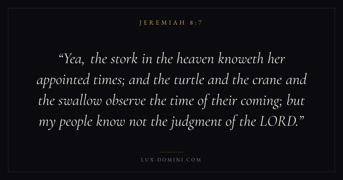 Yea, the stork in the heaven knoweth her appointed times; and the turtle and the crane and the swallow observe the time of their coming; but my people know not the judgment of the LORD.