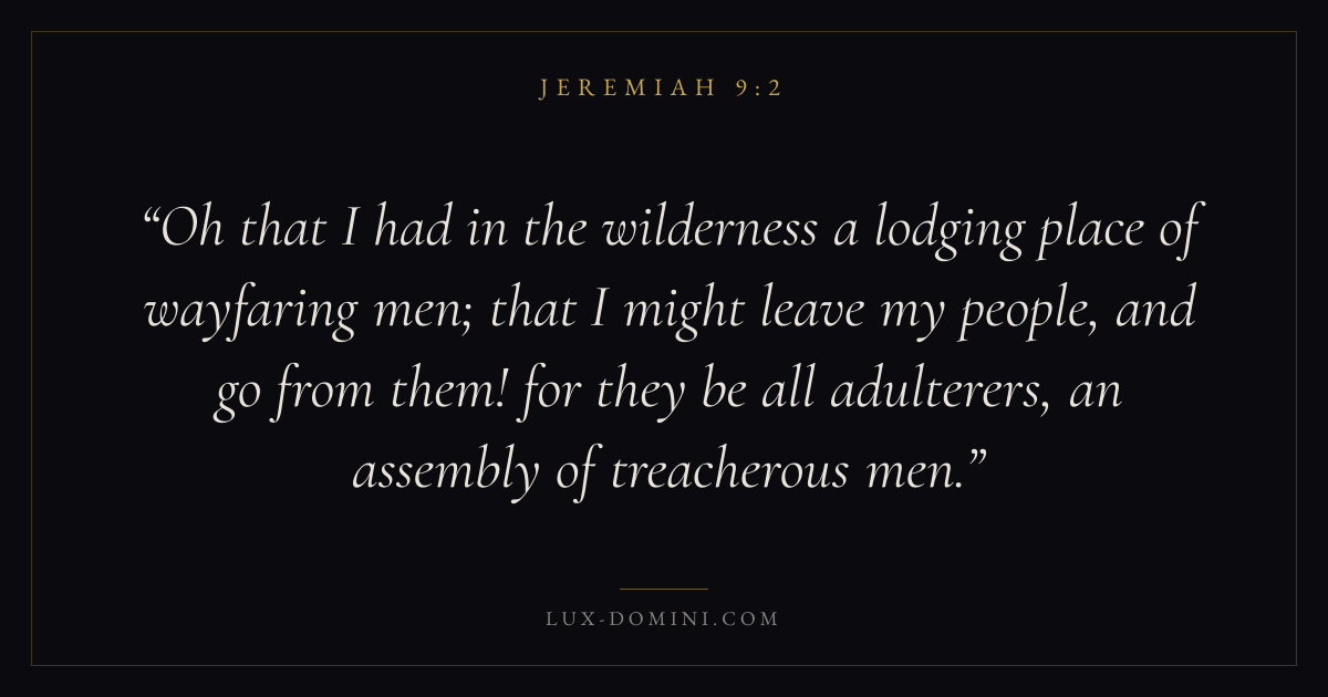 Oh that I had in the wilderness a lodging place of wayfaring men; that I might leave my people, and go from them! for they be all adulterers, an assembly of treacherous men.