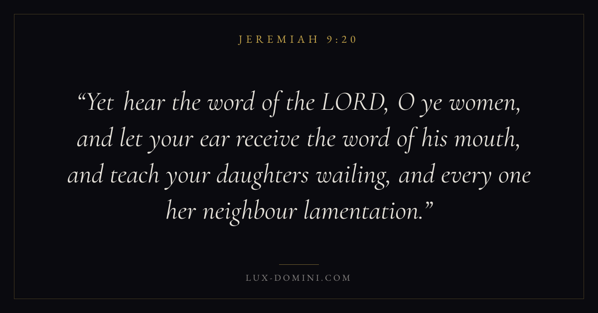 Yet hear the word of the LORD, O ye women, and let your ear receive the word of his mouth, and teach your daughters wailing, and every one her neighbour lamentation.