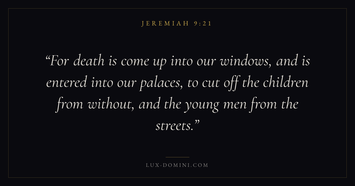 For death is come up into our windows, and is entered into our palaces, to cut off the children from without, and the young men from the streets.
