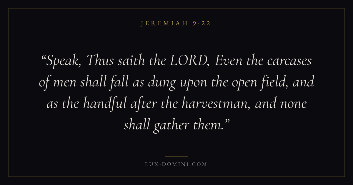 Speak, Thus saith the LORD, Even the carcases of men shall fall as dung upon the open field, and as the handful after the harvestman, and none shall gather them.