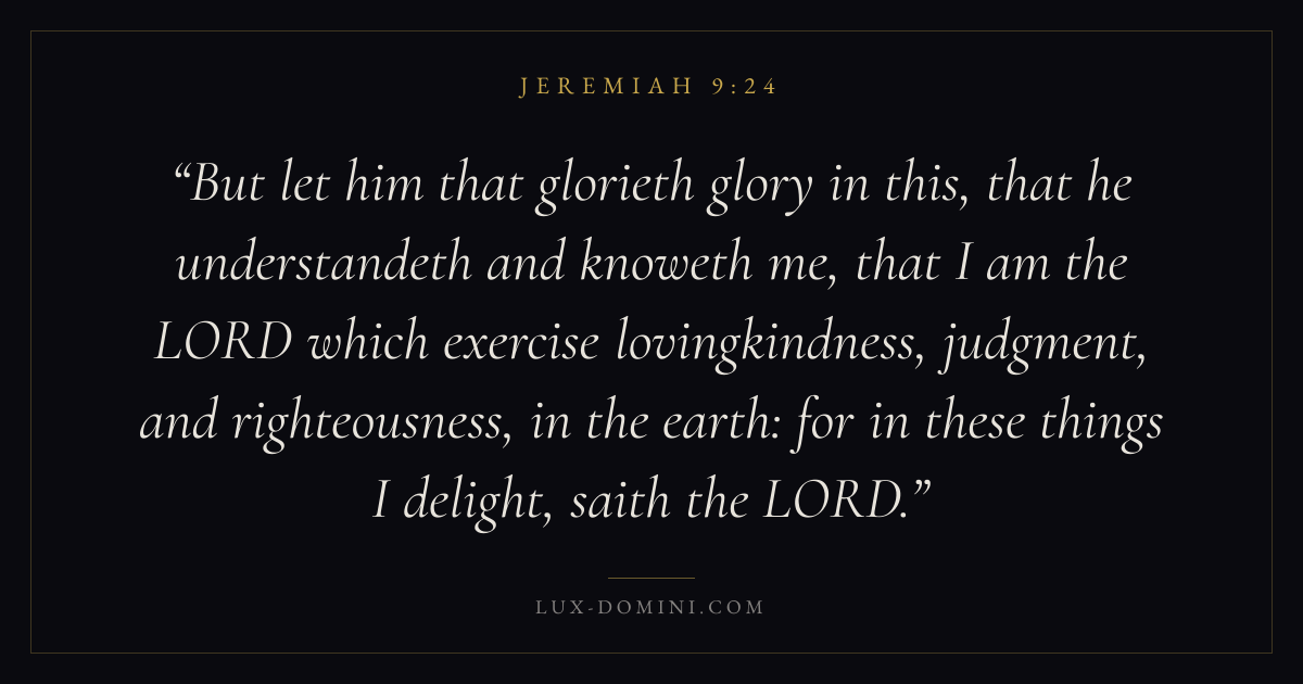 But let him that glorieth glory in this, that he understandeth and knoweth me, that I am the LORD which exercise lovingkindness, judgment, and righteousness, in the earth: for in these things I delight, saith the LORD.