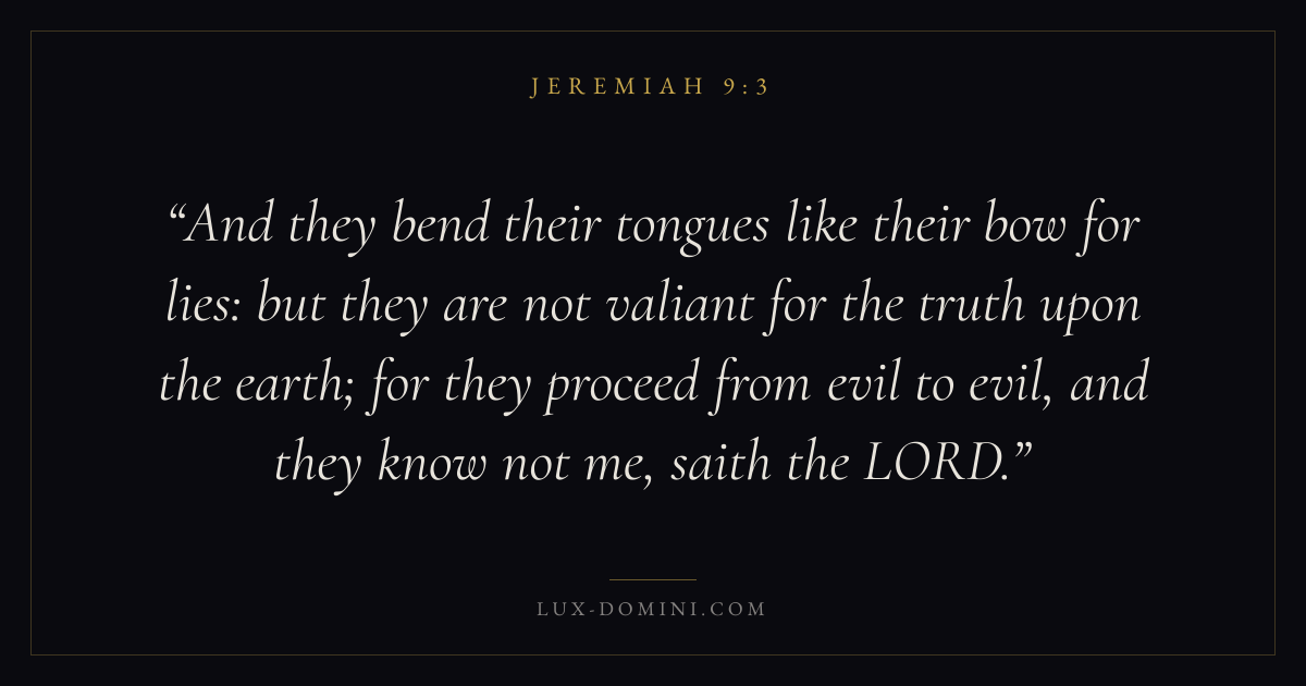 And they bend their tongues like their bow for lies: but they are not valiant for the truth upon the earth; for they proceed from evil to evil, and they know not me, saith the LORD.