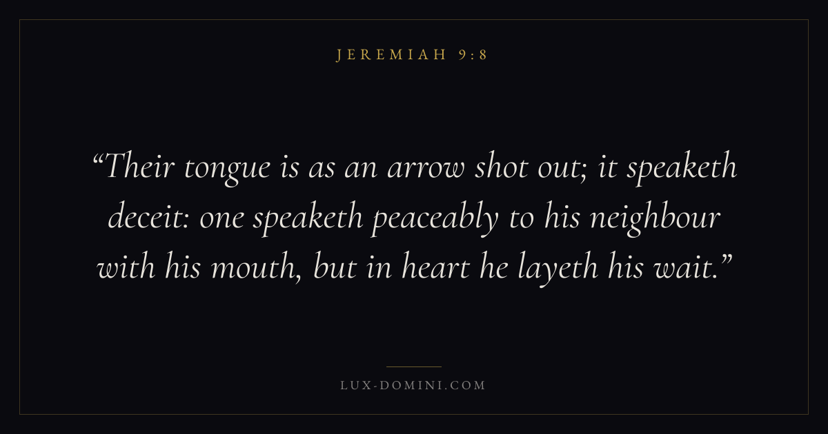Their tongue is as an arrow shot out; it speaketh deceit: one speaketh peaceably to his neighbour with his mouth, but in heart he layeth his wait.