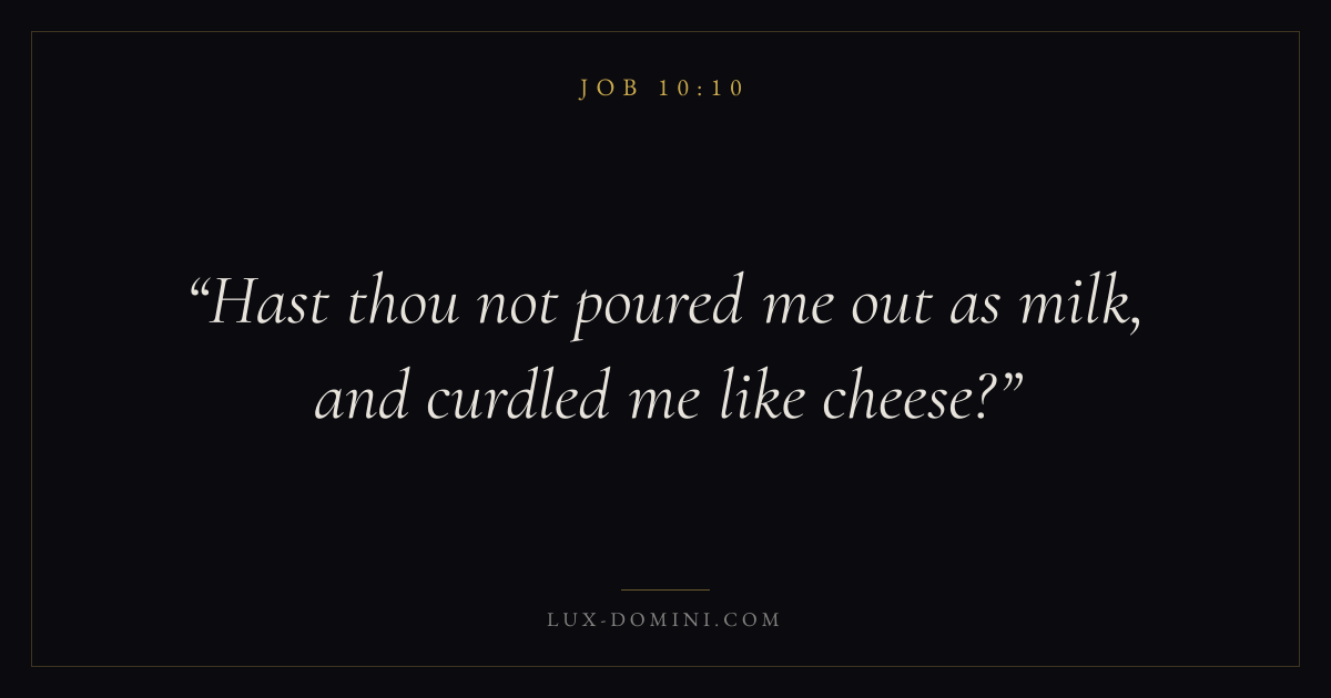 Books / Job / Chapter 10 / Verse 10 ← Job 10:9 Job 10:10 Job 10:11 → Hast thou not poured me out as milk, and curdled me like cheese? Download verse card Share on Twitter Share on Facebook Pin it ✦ Key themes Suffering and trialsWisdomJustice and mercySuffering Read with Job 10:11Romans 8:182 Corinthians 4:17Proverbs 1:7 Related topics Bible verses about suffering and trialsBible verses about wisdomBible verses about justice and mercy ✦ Job Chapter 10 verses V. 1 V. 2 V. 3 V. 4 V. 5 V. 6 V. 7 V. 8 V. 9 V. 10 V. 11 V. 12 V. 13 V. 14 V. 15 V. 16 V. 17 V. 18 V. 19 V. 20 V. 21 V. 22