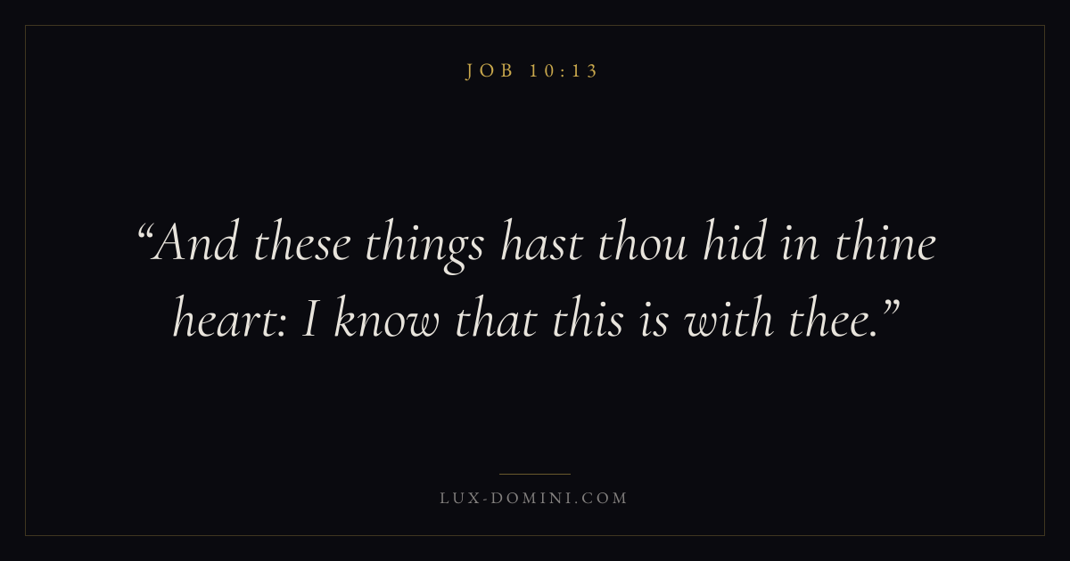 Books / Job / Chapter 10 / Verse 13 ← Job 10:12 Job 10:13 Job 10:14 → And these things hast thou hid in thine heart: I know that this is with thee. Download verse card Share on Twitter Share on Facebook Pin it ✦ Key themes Suffering and trialsWisdomJustice and mercySuffering Read with Job 10:12Romans 8:182 Corinthians 4:17Proverbs 1:7 Related topics Bible verses about suffering and trialsBible verses about wisdomBible verses about justice and mercy ✦ Job Chapter 10 verses V. 1 V. 2 V. 3 V. 4 V. 5 V. 6 V. 7 V. 8 V. 9 V. 10 V. 11 V. 12 V. 13 V. 14 V. 15 V. 16 V. 17 V. 18 V. 19 V. 20 V. 21 V. 22