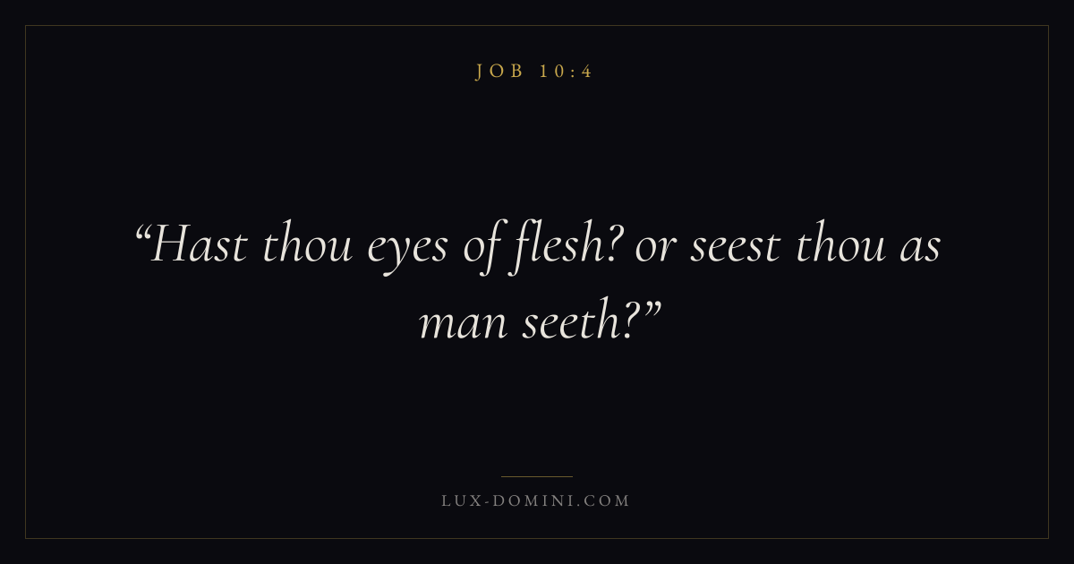 Books / Job / Chapter 10 / Verse 4 ← Job 10:3 Job 10:4 Job 10:5 → Hast thou eyes of flesh? or seest thou as man seeth? Download verse card Share on Twitter Share on Facebook Pin it ✦ Key themes Suffering and trialsPrayerWisdomJustice and mercySuffering Read with Job 10:3Romans 8:182 Corinthians 4:17Matthew 6:9 Related topics Bible verses about suffering and trialsBible verses about prayerBible verses about wisdomBible verses about justice and mercy ✦ Job Chapter 10 verses V. 1 V. 2 V. 3 V. 4 V. 5 V. 6 V. 7 V. 8 V. 9 V. 10 V. 11 V. 12 V. 13 V. 14 V. 15 V. 16 V. 17 V. 18 V. 19 V. 20 V. 21 V. 22