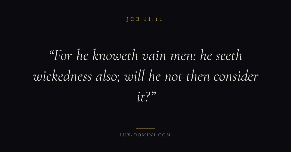 Books / Job / Chapter 11 / Verse 11 ← Job 11:10 Job 11:11 Job 11:12 → For he knoweth vain men: he seeth wickedness also; will he not then consider it? Download verse card Share on Twitter Share on Facebook Pin it ✦ Key themes Suffering and trialsWisdomJustice and mercySuffering Read with Job 11:10Job 11:12Romans 8:182 Corinthians 4:17 Related topics Bible verses about suffering and trialsBible verses about wisdomBible verses about justice and mercy ✦ Job Chapter 11 verses V. 1 V. 2 V. 3 V. 4 V. 5 V. 6 V. 7 V. 8 V. 9 V. 10 V. 11 V. 12 V. 13 V. 14 V. 15 V. 16 V. 17 V. 18 V. 19 V. 20