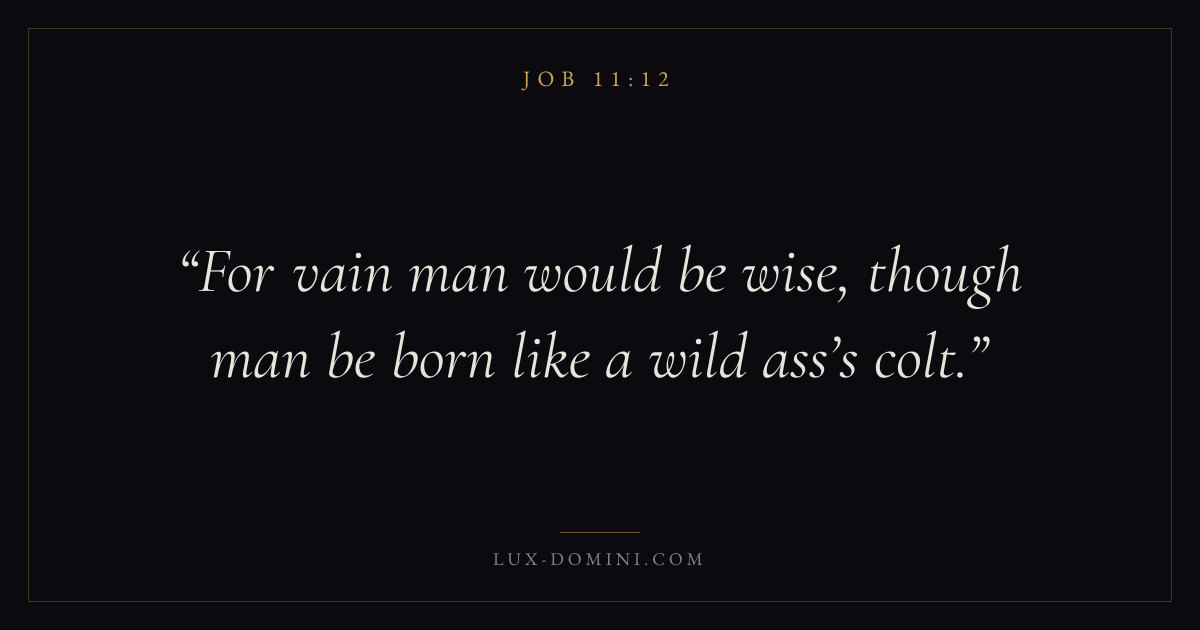 Books / Job / Chapter 11 / Verse 12 ← Job 11:11 Job 11:12 Job 11:13 → For vain man would be wise, though man be born like a wild ass’s colt. Download verse card Share on Twitter Share on Facebook Pin it ✦ Key themes Suffering and trialsWisdomJustice and mercySuffering Read with Job 11:10Job 11:11Romans 8:182 Corinthians 4:17 Related topics Bible verses about suffering and trialsBible verses about wisdomBible verses about justice and mercy ✦ Job Chapter 11 verses V. 1 V. 2 V. 3 V. 4 V. 5 V. 6 V. 7 V. 8 V. 9 V. 10 V. 11 V. 12 V. 13 V. 14 V. 15 V. 16 V. 17 V. 18 V. 19 V. 20