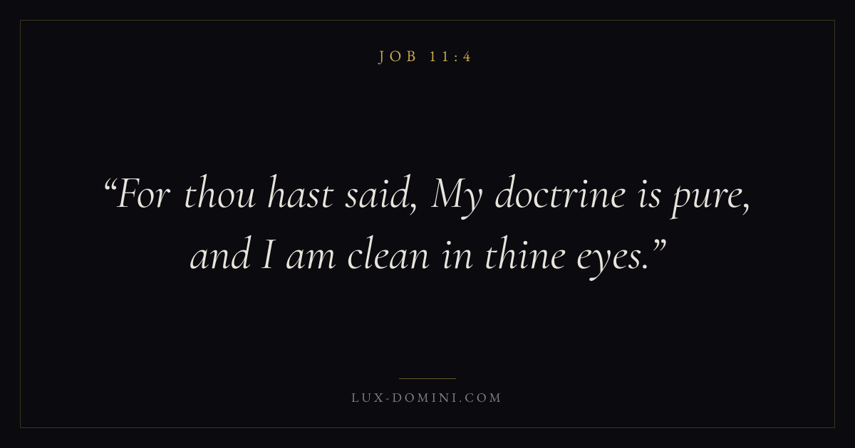 Books / Job / Chapter 11 / Verse 4 ← Job 11:3 Job 11:4 Job 11:5 → For thou hast said, My doctrine is pure, and I am clean in thine eyes. Download verse card Share on Twitter Share on Facebook Pin it ✦ Key themes Suffering and trialsWisdomJustice and mercySuffering Read with Job 11:3Job 11:5Romans 8:182 Corinthians 4:17 Related topics Bible verses about suffering and trialsBible verses about wisdomBible verses about justice and mercy ✦ Job Chapter 11 verses V. 1 V. 2 V. 3 V. 4 V. 5 V. 6 V. 7 V. 8 V. 9 V. 10 V. 11 V. 12 V. 13 V. 14 V. 15 V. 16 V. 17 V. 18 V. 19 V. 20