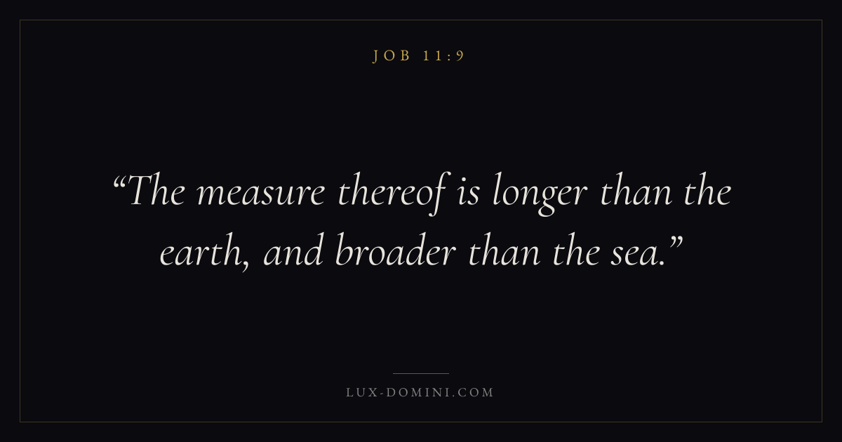 Books / Job / Chapter 11 / Verse 9 ← Job 11:8 Job 11:9 Job 11:10 → The measure thereof is longer than the earth, and broader than the sea. Download verse card Share on Twitter Share on Facebook Pin it ✦ Key themes Suffering and trialsWisdomJustice and mercySuffering Read with Job 11:7Job 11:8Romans 8:182 Corinthians 4:17 Related topics Bible verses about suffering and trialsBible verses about wisdomBible verses about justice and mercy ✦ Job Chapter 11 verses V. 1 V. 2 V. 3 V. 4 V. 5 V. 6 V. 7 V. 8 V. 9 V. 10 V. 11 V. 12 V. 13 V. 14 V. 15 V. 16 V. 17 V. 18 V. 19 V. 20