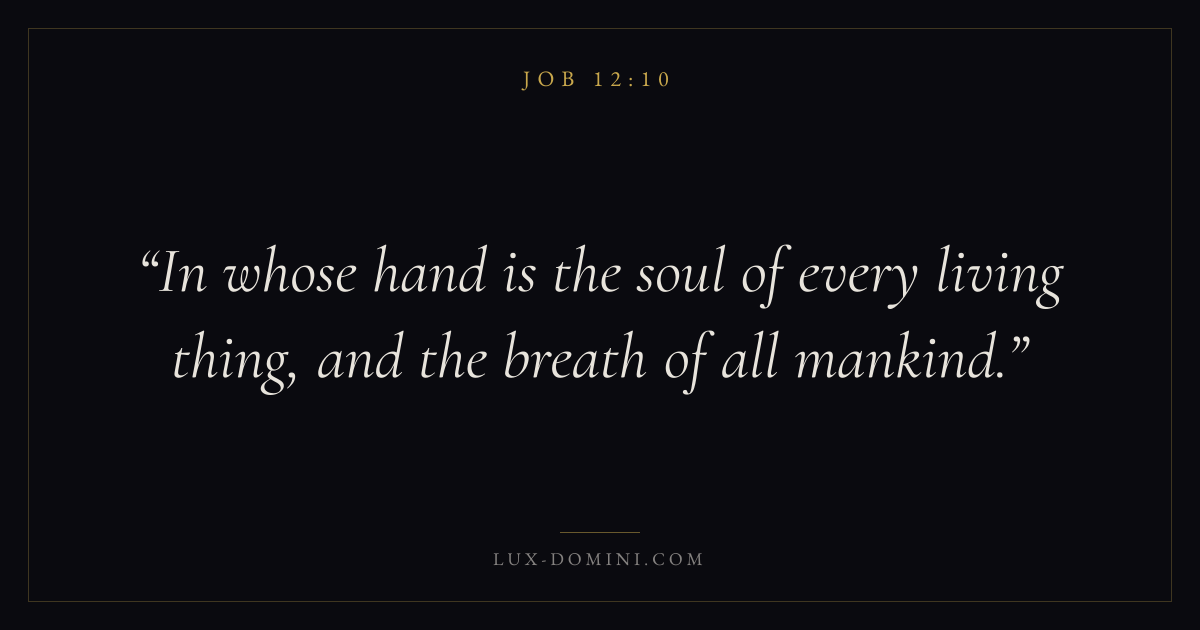 Books / Job / Chapter 12 / Verse 10 ← Job 12:9 Job 12:10 Job 12:11 → In whose hand is the soul of every living thing, and the breath of all mankind. Download verse card Share on Twitter Share on Facebook Pin it ✦ Key themes Suffering and trialsWisdomJustice and mercySuffering Read with Job 12:9Job 12:11Romans 8:182 Corinthians 4:17 Related topics Bible verses about suffering and trialsBible verses about wisdomBible verses about justice and mercy ✦ Job Chapter 12 verses V. 1 V. 2 V. 3 V. 4 V. 5 V. 6 V. 7 V. 8 V. 9 V. 10 V. 11 V. 12 V. 13 V. 14 V. 15 V. 16 V. 17 V. 18 V. 19 V. 20 V. 21 V. 22 V. 23 V. 24 V. 25