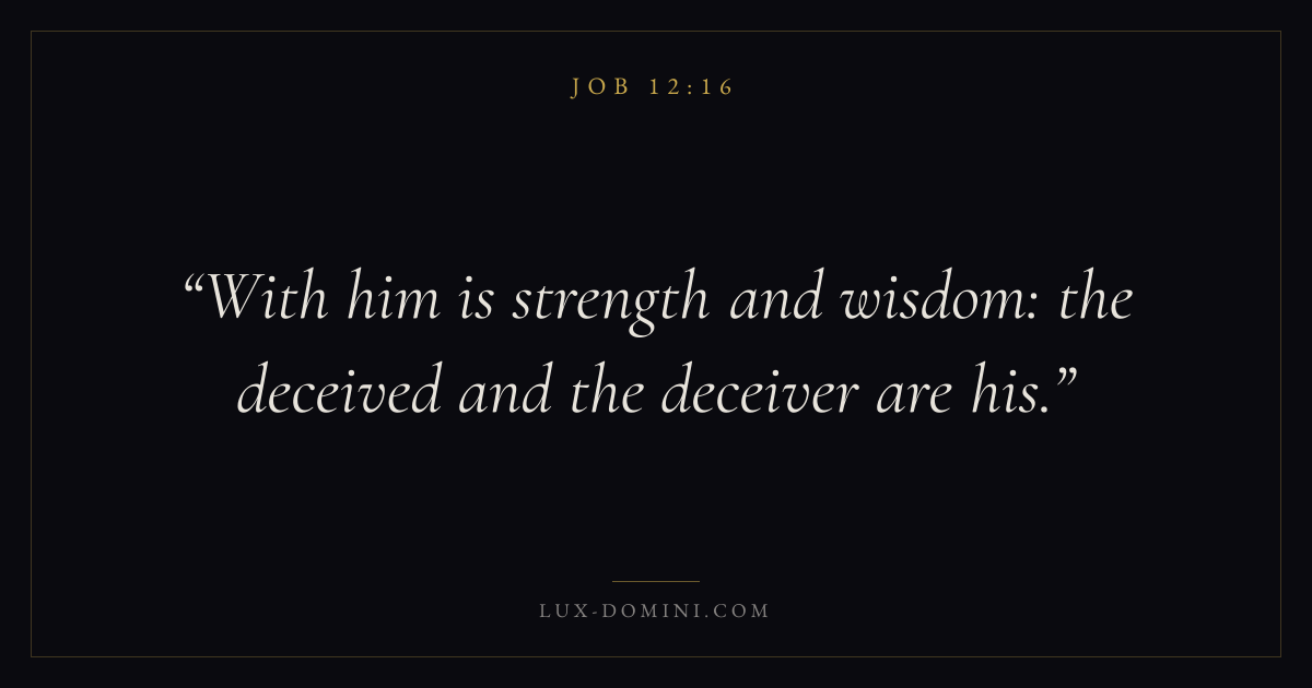 Books / Job / Chapter 12 / Verse 16 ← Job 12:15 Job 12:16 Job 12:17 → With him is strength and wisdom: the deceived and the deceiver are his. Download verse card Share on Twitter Share on Facebook Pin it ✦ Key themes Suffering and trialsWisdomJustice and mercySuffering Read with Job 12:17Romans 8:182 Corinthians 4:17Proverbs 1:7 Related topics Bible verses about suffering and trialsBible verses about wisdomBible verses about justice and mercy ✦ Job Chapter 12 verses V. 1 V. 2 V. 3 V. 4 V. 5 V. 6 V. 7 V. 8 V. 9 V. 10 V. 11 V. 12 V. 13 V. 14 V. 15 V. 16 V. 17 V. 18 V. 19 V. 20 V. 21 V. 22 V. 23 V. 24 V. 25