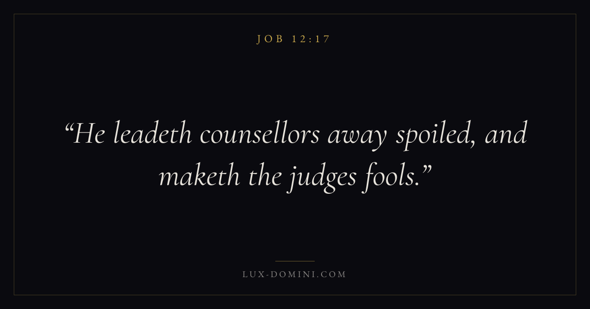 Books / Job / Chapter 12 / Verse 17 ← Job 12:16 Job 12:17 Job 12:18 → He leadeth counsellors away spoiled, and maketh the judges fools. Download verse card Share on Twitter Share on Facebook Pin it ✦ Key themes Suffering and trialsWisdomJustice and mercySuffering Read with Job 12:16Romans 8:182 Corinthians 4:17Proverbs 1:7 Related topics Bible verses about suffering and trialsBible verses about wisdomBible verses about justice and mercy ✦ Job Chapter 12 verses V. 1 V. 2 V. 3 V. 4 V. 5 V. 6 V. 7 V. 8 V. 9 V. 10 V. 11 V. 12 V. 13 V. 14 V. 15 V. 16 V. 17 V. 18 V. 19 V. 20 V. 21 V. 22 V. 23 V. 24 V. 25