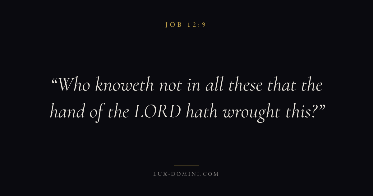 Books / Job / Chapter 12 / Verse 9 ← Job 12:8 Job 12:9 Job 12:10 → Who knoweth not in all these that the hand of the LORD hath wrought this? Download verse card Share on Twitter Share on Facebook Pin it ✦ Key themes Suffering and trialsWisdomJustice and mercySuffering Read with Job 12:10Job 12:11Romans 8:182 Corinthians 4:17 Related topics Bible verses about suffering and trialsBible verses about wisdomBible verses about justice and mercy ✦ Job Chapter 12 verses V. 1 V. 2 V. 3 V. 4 V. 5 V. 6 V. 7 V. 8 V. 9 V. 10 V. 11 V. 12 V. 13 V. 14 V. 15 V. 16 V. 17 V. 18 V. 19 V. 20 V. 21 V. 22 V. 23 V. 24 V. 25