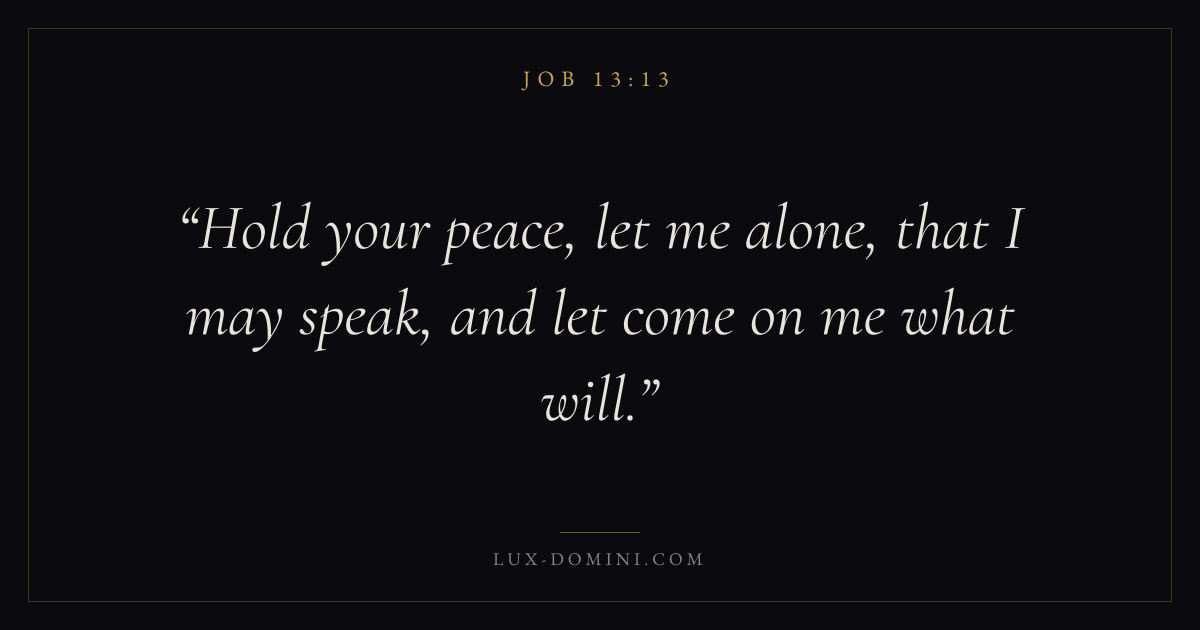 Books / Job / Chapter 13 / Verse 13 ← Job 13:12 Job 13:13 Job 13:14 → Hold your peace, let me alone, that I may speak, and let come on me what will. Download verse card Share on Twitter Share on Facebook Pin it ✦ Key themes HopeSuffering and trialsWisdomJustice and mercySuffering Read with Job 13:14Romans 8:24Revelation 21:4Romans 8:18 Related topics Bible verses about hopeBible verses about suffering and trialsBible verses about wisdomBible verses about justice and mercy ✦ Job Chapter 13 verses V. 1 V. 2 V. 3 V. 4 V. 5 V. 6 V. 7 V. 8 V. 9 V. 10 V. 11 V. 12 V. 13 V. 14 V. 15 V. 16 V. 17 V. 18 V. 19 V. 20 V. 21 V. 22 V. 23 V. 24 V. 25 V. 26 V. 27 V. 28